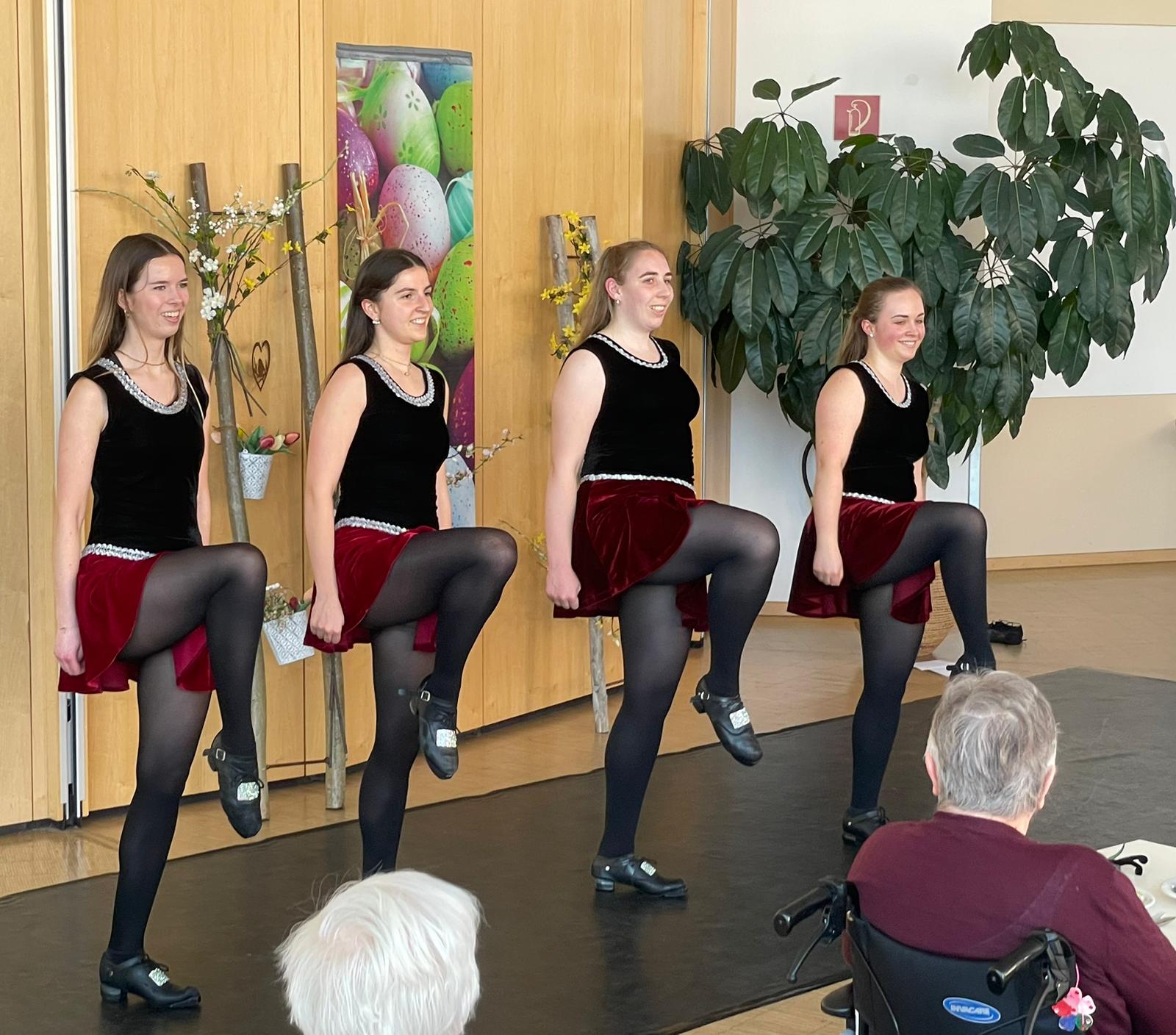 Gleich am Folgetag trat eine kleinere Gruppe von vier Tänzerinnen beim Frühlingsfest im Altenheim in Ehningen auf. Neben den Tänzen gab die Gruppe auch Einblicke in die Geschichte des irischen Tanzens und Irlands und konnte so ein abwechslungsreiches und rundes Programm gestalten. Das positive Feedback und die Freude des Publikums machten den Auftritt zu einem schönen Erlebnis.
